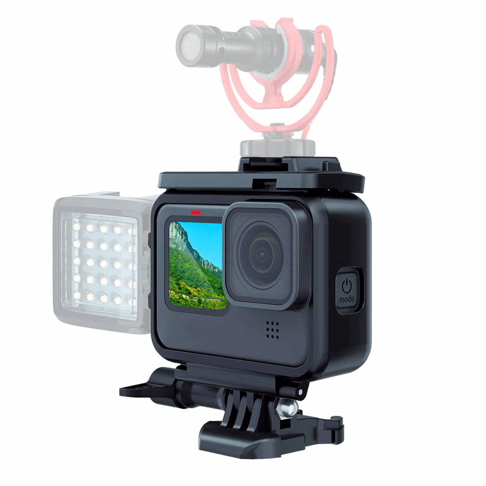 O Case Moldura Frame Armação para GoPro Hero 12/11/10/9 possui duas montagens de sapata fria, na parte superior e na lateral. Deslize facilmente um Iluminador de LED, Microfones Shotgun entre outros.