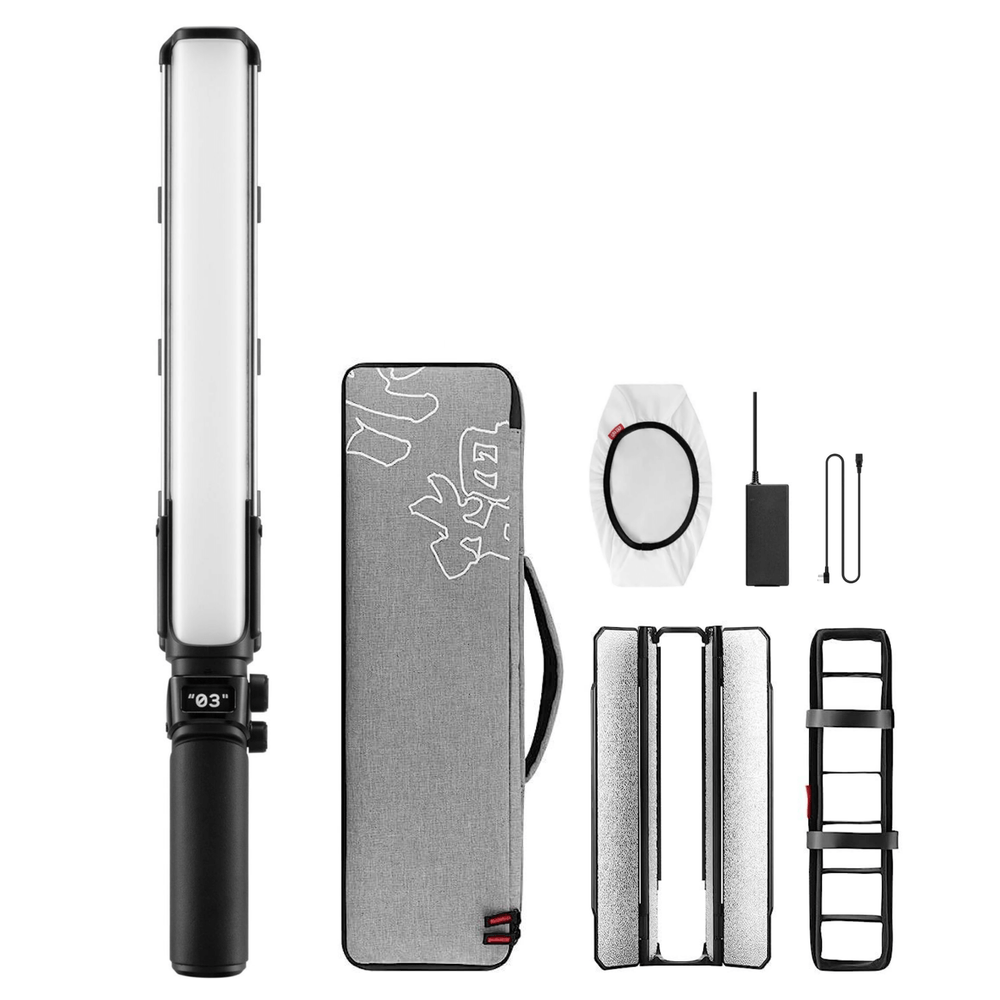 No Kit Zhiyun FiveRay V60 Combo estão incluídos modificadores projetados especificamente para o Bastão Stick FIVERAY V60, incluindo um barndoor retrátil, um difusor translúcido e uma grade. Ele também vem com uma fonte de alimentação (Bivolt), um cabo de carregamento USB-C e um Case de Armazenamento e Transporte.