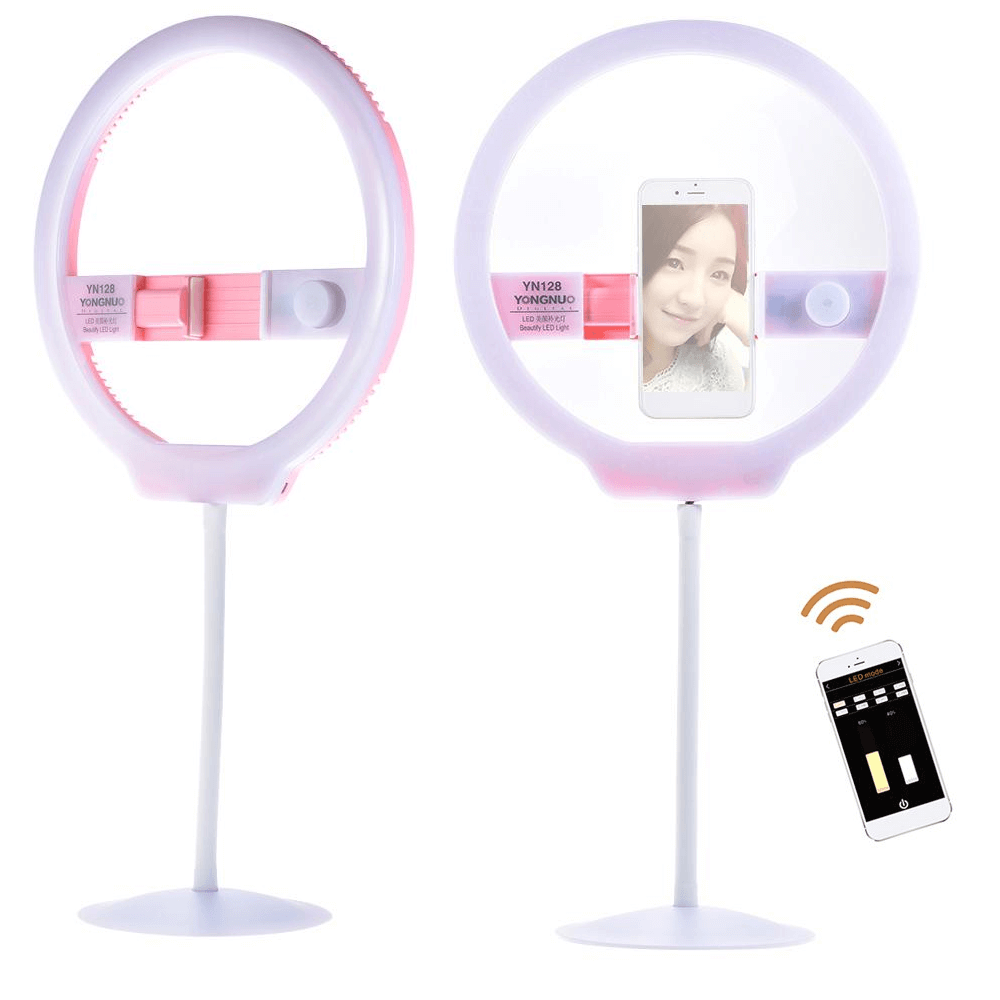 O Iluminador Circular de LED Yongnuo YN128 II Beauty Light Ring Light Portátil Bi-Color com espelho integrado, e controlável por aplicativo Yongnuo, na cor Rosa/Pink e Potência de 7.6W (Equivalente a aprox. 54W incandescente), é projetado como uma luz de preenchimento do tipo tudo em um para Vloggers, tambem podendo ser usado em Entrevistas e Fotografia de Produtos. Ele possui um Suporte para SmartPhone e Espelho, no centro, fornece temperatura de cor ajustável de 3200-5500K com uma classificação TLCI / CRI de 95+. Medindo aproximadamente 11" / 27cm de largura, suporta qualquer telefone. Além disso, possui um suporte ajustável no Estilo Gooseneck "pescoço de ganso" para que você possa apontá-lo exatamente onde precisa, sem adicionar acessórios de suporte adicionais. O suporte pode ser removido para uso de Rosca 1/4"-20 na parte inferior da luz usada para montar a luz em vários outros suportes. Também está incluída uma Mini Cabeça Ball heado com Sapata de Câmera para colocar o Anel Ring Light LED YN128II em cima de sua ou Câmera DSLR e Mirrorless.