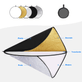 Desenvolvido em formato circular, o Rebatedor Fotográfico 5 em 1 possui cinco superfícies refletoras diferentes pode ser usado para preencher, refletir, difundir, absorver ou suavizar a luz. Ajudando a aumentar a eficiência de Criação de Fotografia, que pode ser usada para preencher difusa, absorve ou suaviza a luz. Isso serve como um acessório útil para qualquer tipo de fotógrafo.