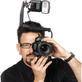 Seu design deste suporte mantém o flash alto acima do corpo da câmera e pode girar o flash 90º de forma rápida e suave conforme você alterna entre disparos horizontais e verticais. Com o flash destacado do corpo, é menos provável que você tenha efeito de olhos vermelhos, e com o mecanismo giratório, o flash fica sempre acima da lente, eliminando sombras laterais e fornecendo uma iluminação equilibrada e eficaz.